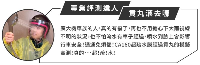 當然,長時間使用後,表面難免出現些許刮痕導致該處疏水力下降,但面積比例只要不是太高,對視線影響就不大。另外,CA160 也通過 UV 燈管近距離照射實驗、80 度高溫烘烤實驗、夏季戶外曝曬三個月實驗,產品皆無老化或失效,可見其耐用程度足以滿足全年日常使用。