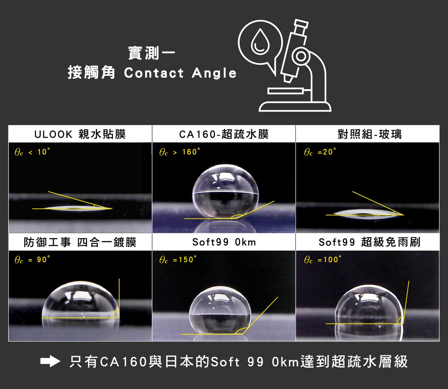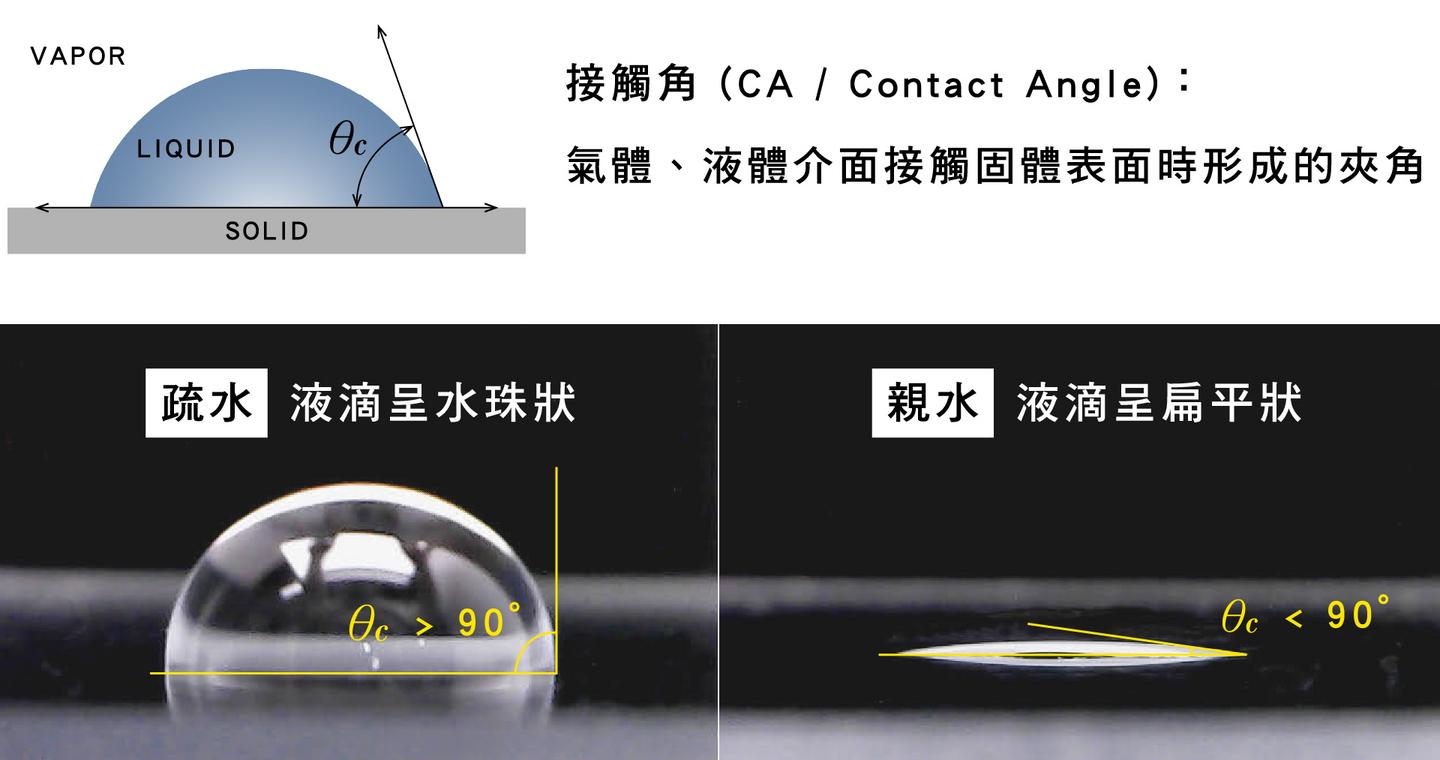 當接觸角大於 160 度時,是連「極細水霧」都沾不上去,而且不需吹風、不需速度,小水珠就直接滑落!