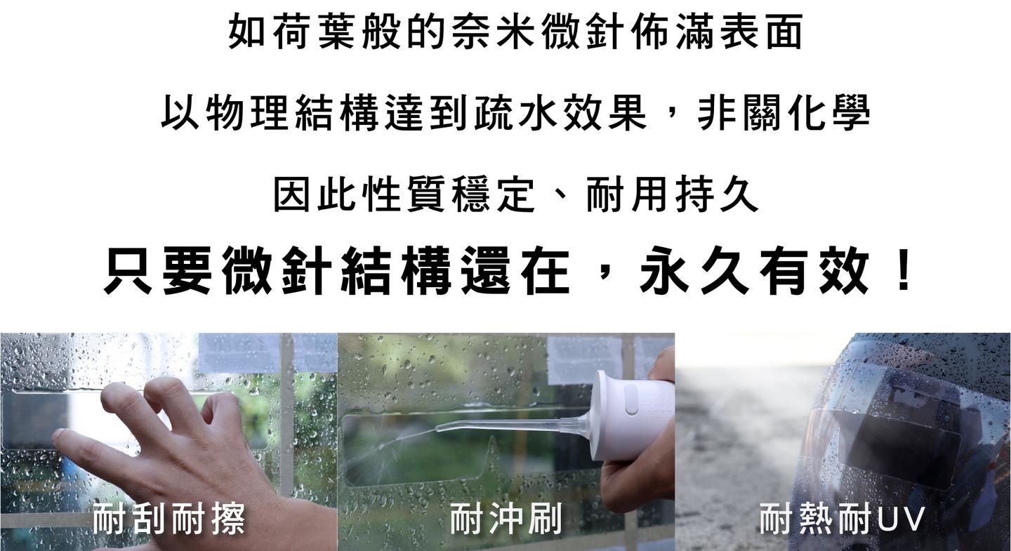- 最長效 | 奈米微針物理性疏水,結構不壞,永久有效