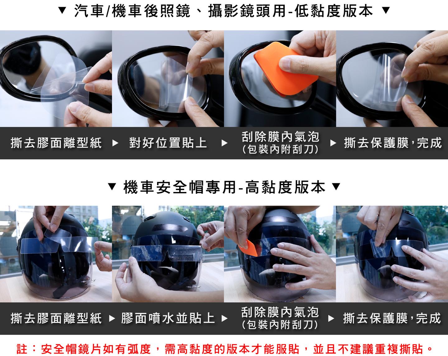 - 高黏度版:可貼附橫豎都有弧度的曲面,如機車安全帽鏡片,不建議重複撕貼。
