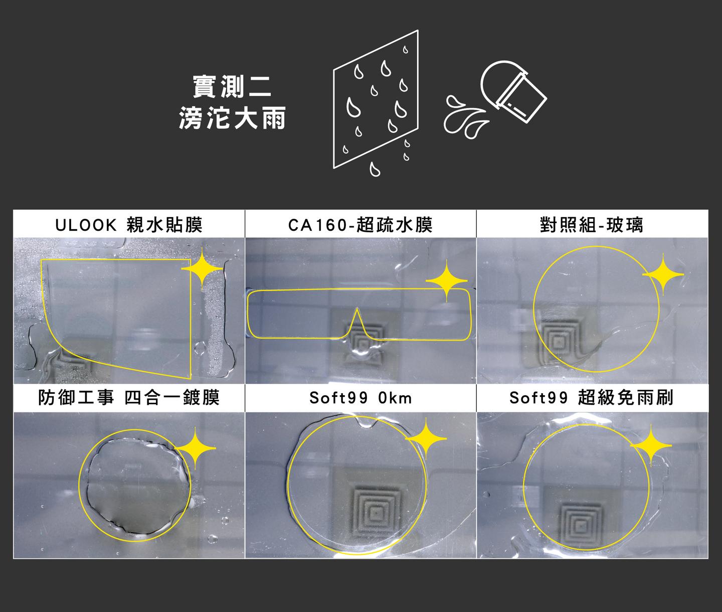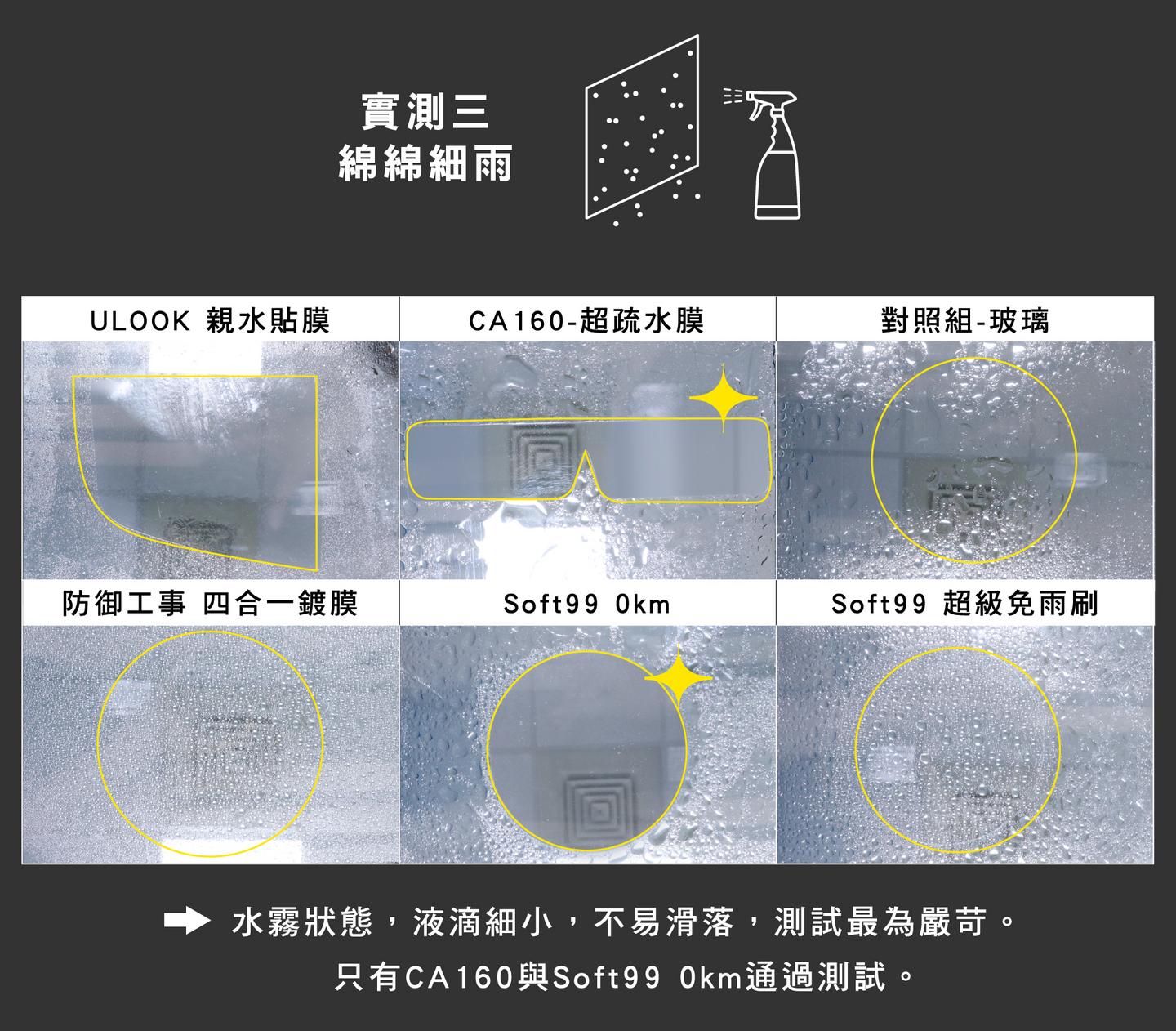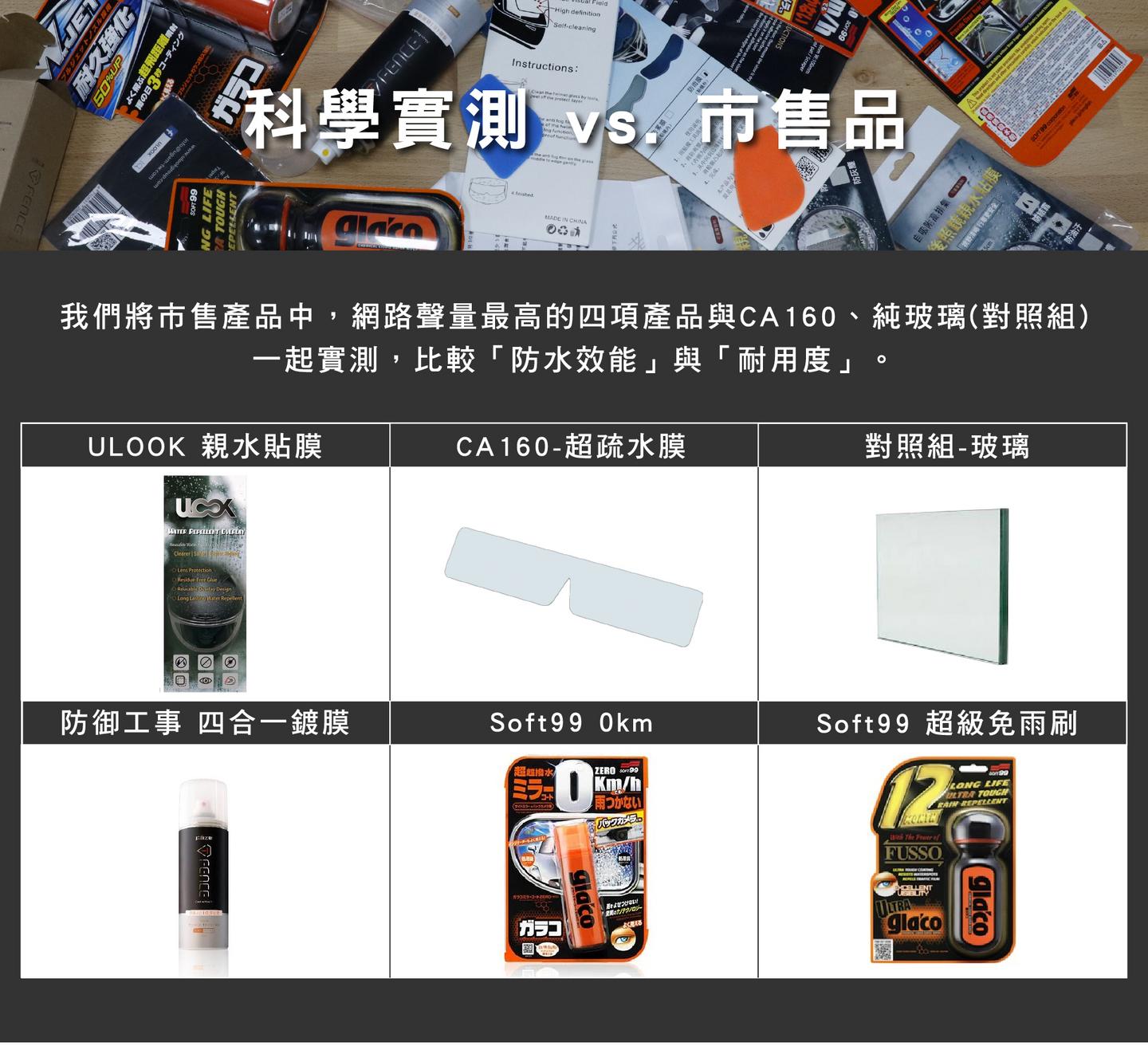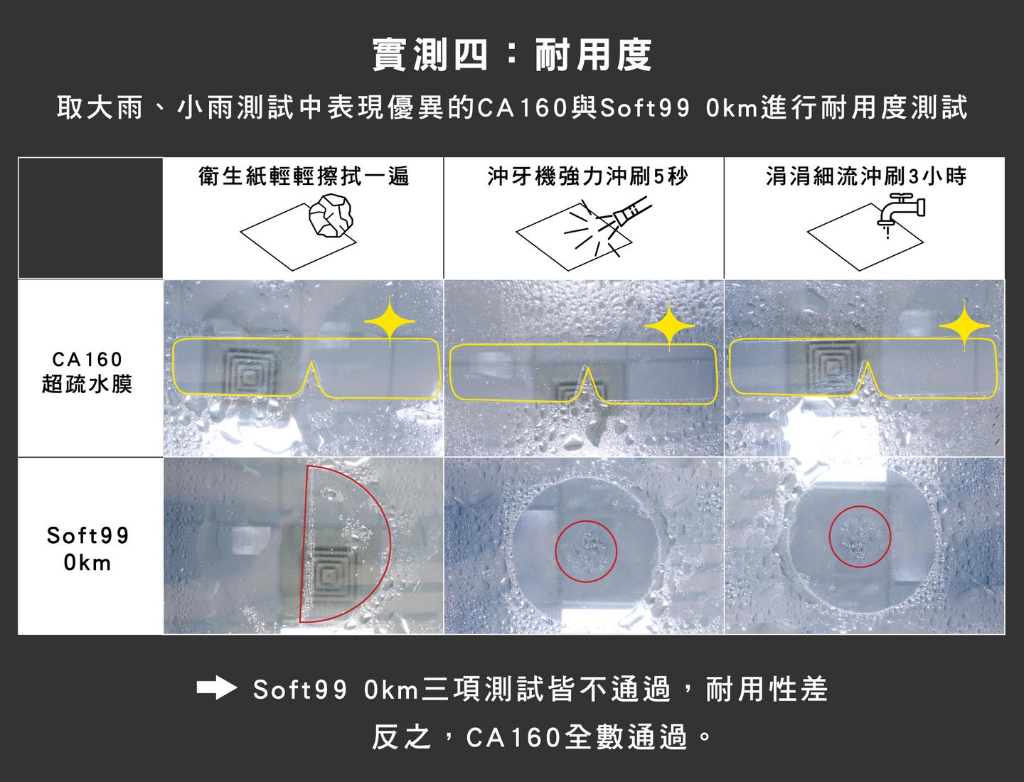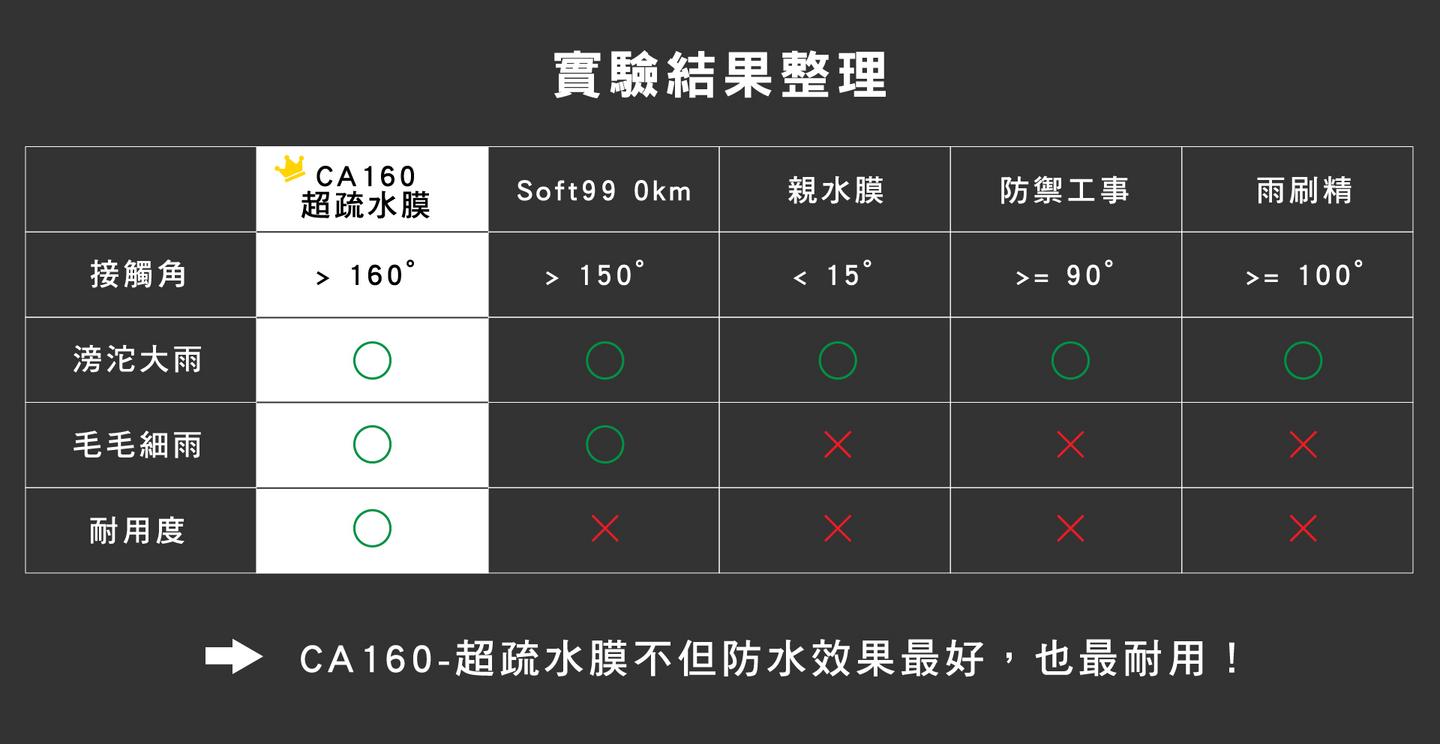 以上實驗過程,可觀看影片了解更多細節。簡單來說,就防潑水的效果而言,市售品只有「SOFT99 0km」可與 CA160 匹敵,其餘只要雨滴小就效果不彰。