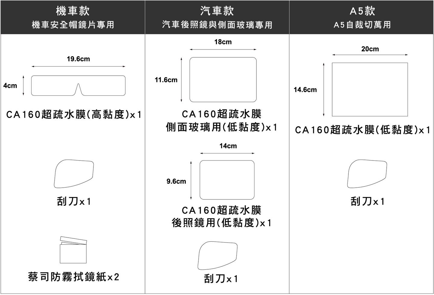 此款為「低黏度版」,可重複撕貼。為達到最優質的使用體驗,側面玻璃與後照鏡都需要貼 CA160,因此一組是兩片,可貼汽車的一邊。因此若希望汽車左右兩側的後照鏡都能享受無雨視野,會需要買兩組共四片來貼唷!