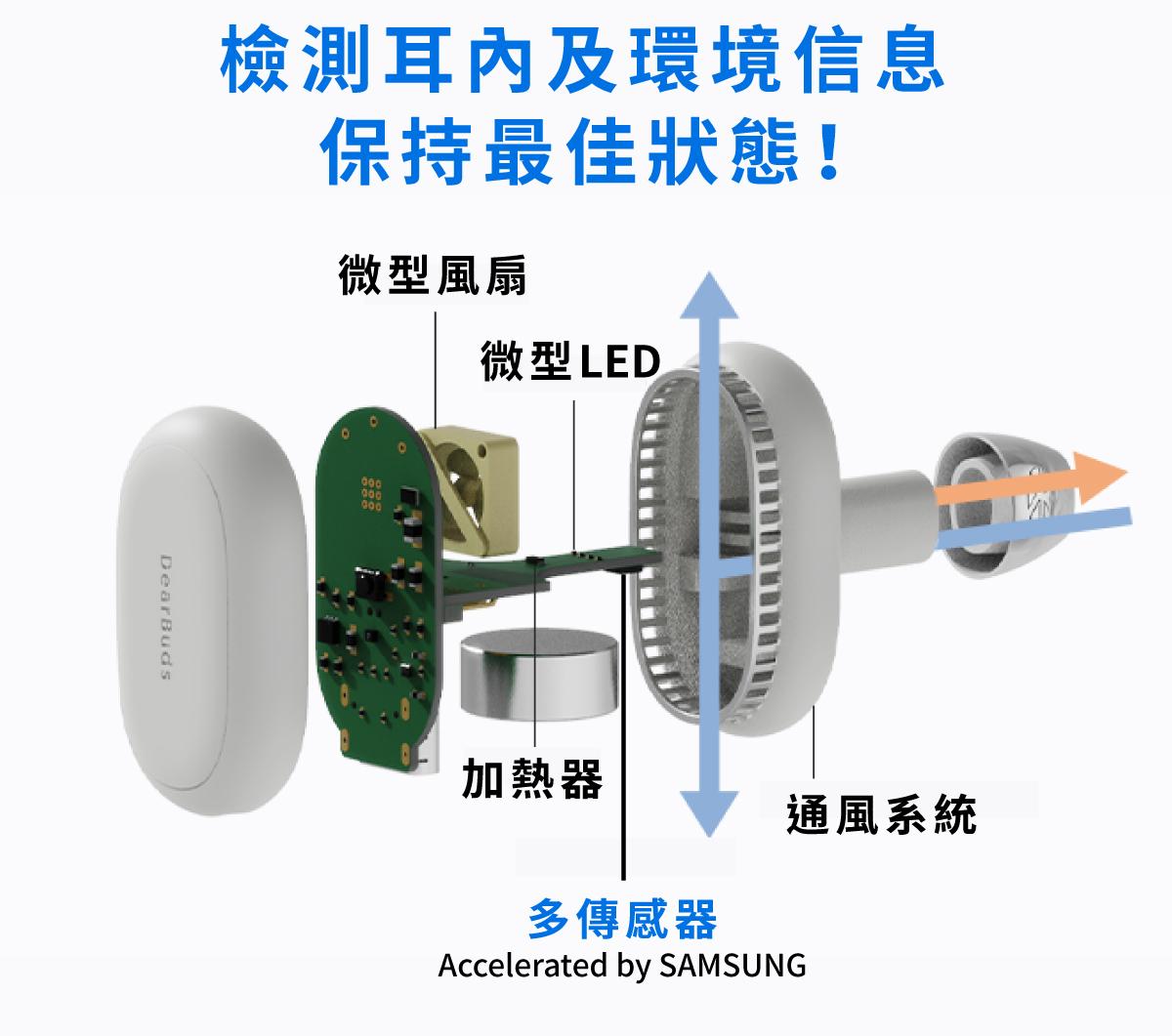 DearBuds SE 配備了多感測器,可以即時準確測量耳內的溫度和濕度,獨有的除濕技術,可在 3 分鐘內去除耳朵中的濕氣。