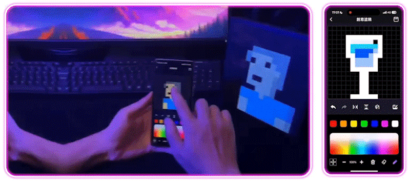 iDotMatrix APP 提供塗鴉功能,透過創意塗鴉、創意動畫、文字功能就能生成屬於自己的像素藝術,且內建插入圖片的選擇,可以將自己喜歡的圖示輕鬆展示在像素精靈上!
