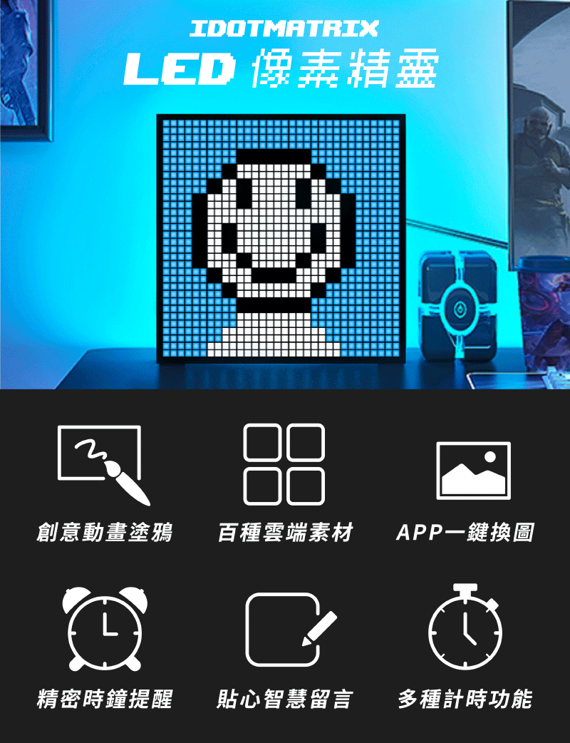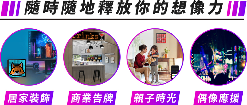 透過 iDotMatrix APP 一鍵提升你的遊戲、電影和音樂體驗,適用於居家、辦公室、商店、派對等所有場合,讓哪裡都可以是像素精靈的歸屬!
