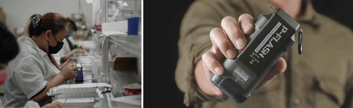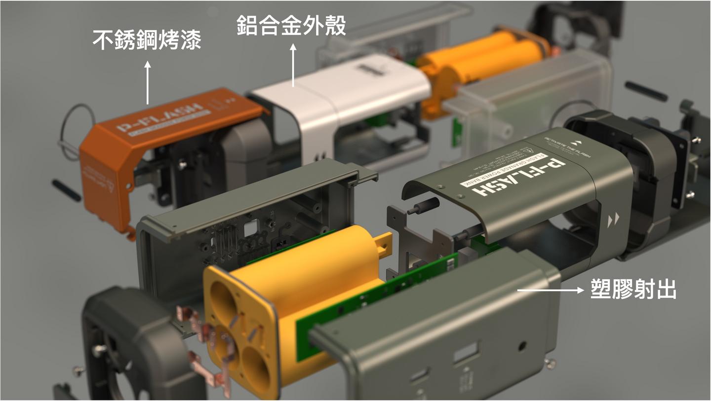 P-Flash 70%以上皆為鋁鎂合金製作,每一顆都需要半手工細心打磨、拋光、雕刻、烤漆、印刷、組裝等等一整串高成本工藝參與,機身與保險桿皆為鋁鎂合金與不銹鋼製成,扎實沈穩,防爆堅固,複合異材料,機身巧輕量,與一般行動電源重量相仿,加上一群資深電子工程師為之設計電路板,編寫智慧程式。