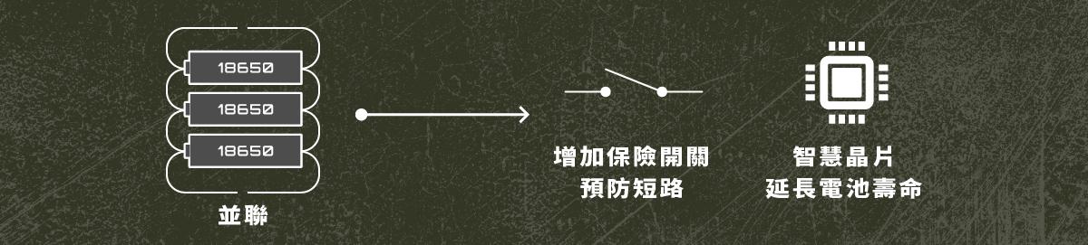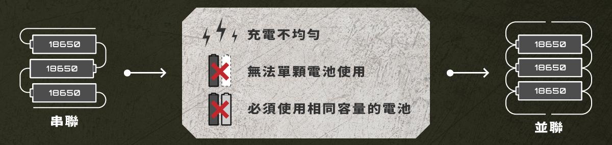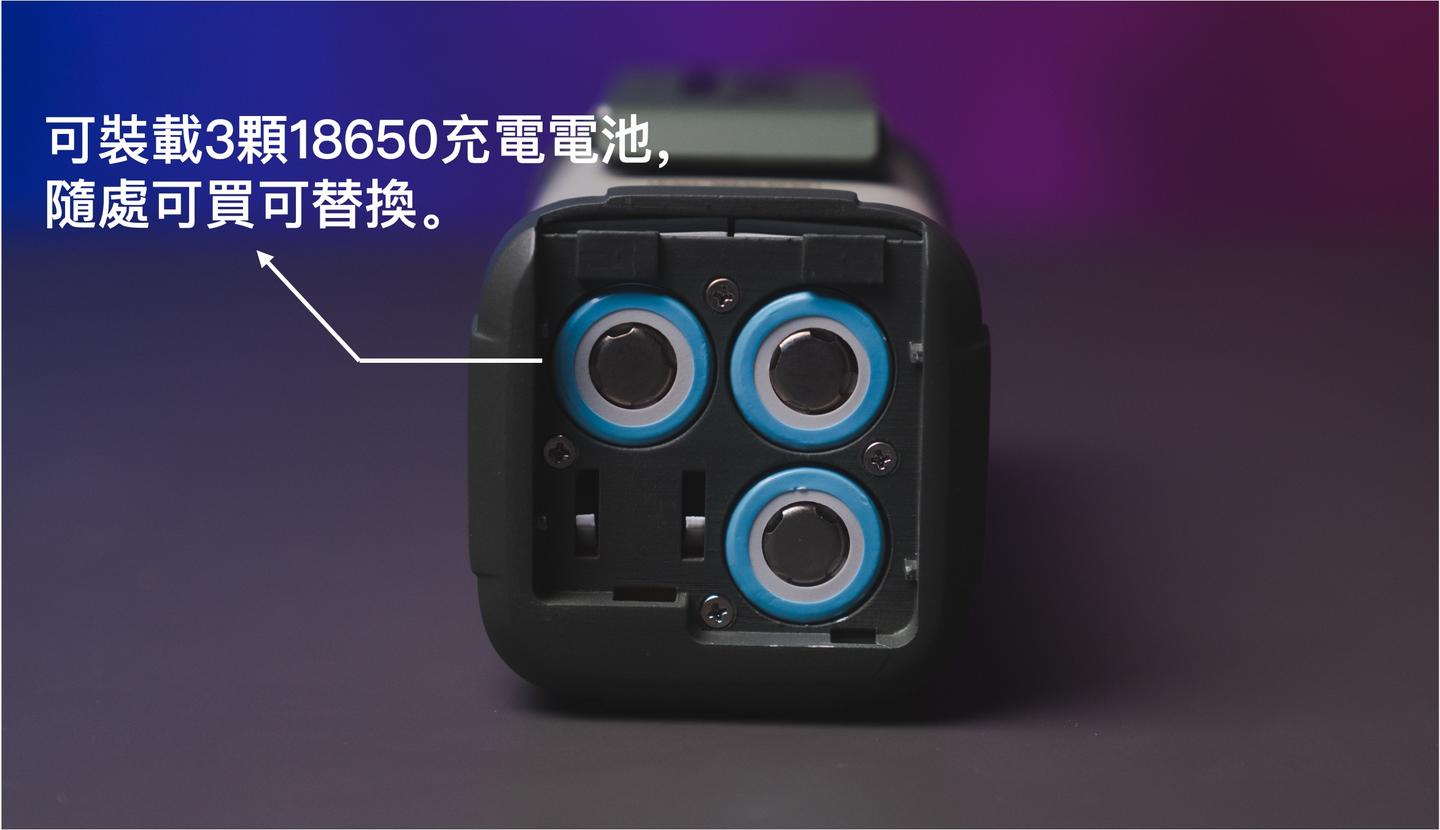 使用18650電池並聯式串接可以裝填單顆、雙顆、三顆電池,最彈性調度電力,且不挑電池每滴電力都能被使用,每顆電池槽都有安全閥與溫度檢測開關,使用安心安全升級。