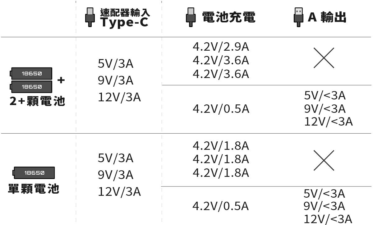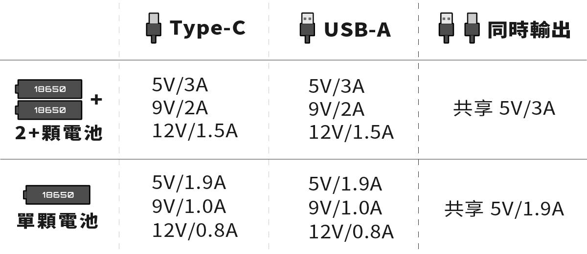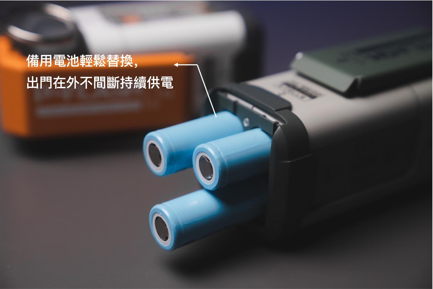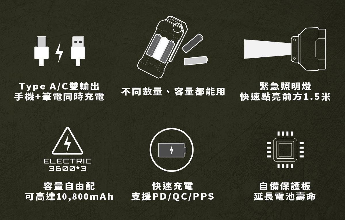 高自由| 18650電池隨處取得,不同容量、廠牌,裝一顆、兩顆、三顆都可以使用,隨時補充電力 高速充電| 支援 PD/QC/PPS 多種快充協議安全智慧檢測晶片| 電池匣自備保險開關,智慧調整延長電池壽命