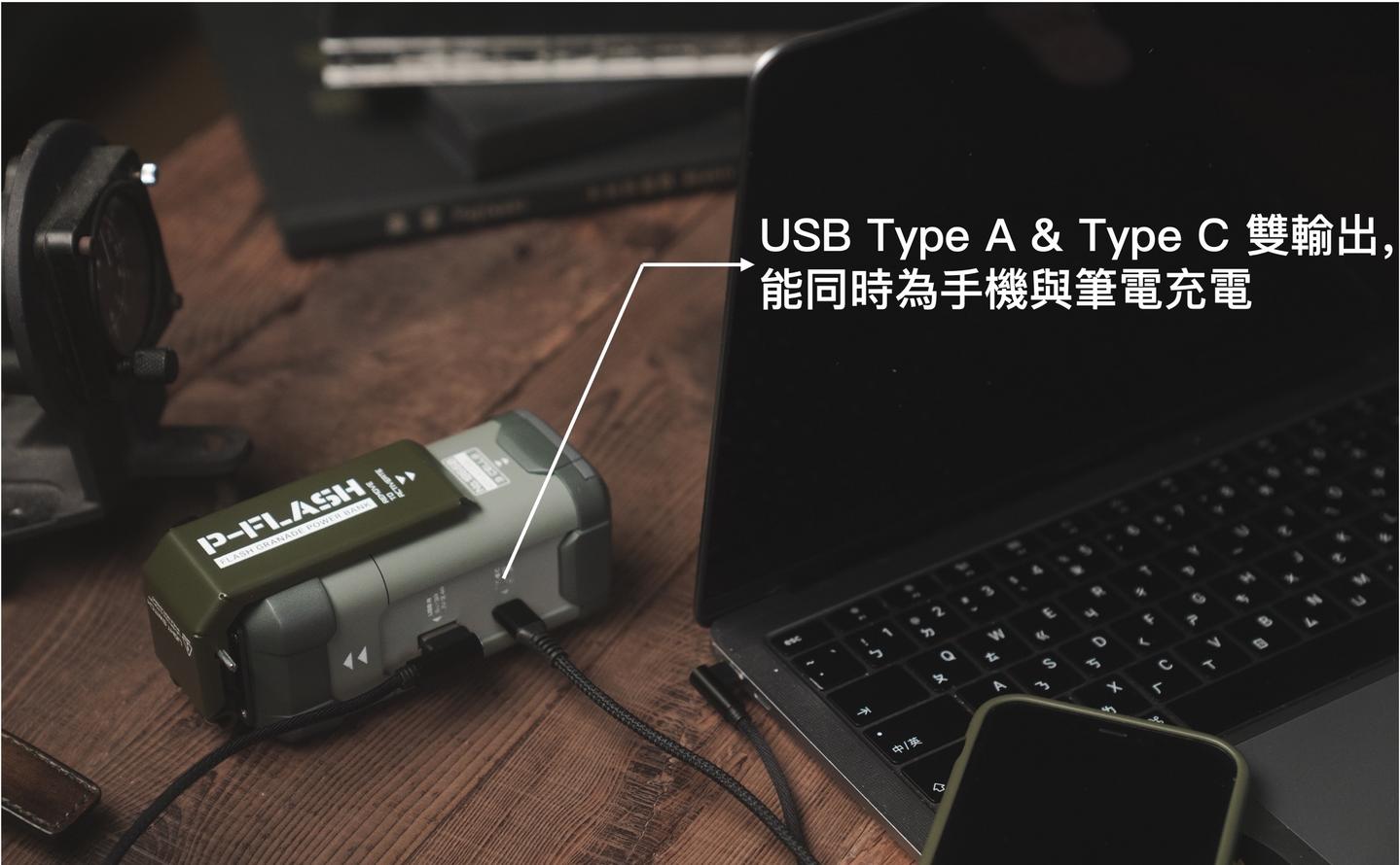 USB Type A & Type C 雙輸出,能同時為手機與筆電充電。