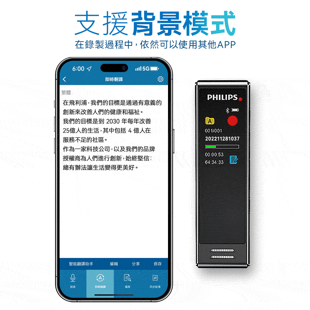 全彩螢幕介面操作簡易,搭配智慧 APP 操作直覺化,不必擔心沒有錄到、沒按到開始鍵。支援背景模式,錄製時依然可以使用其他 APP ,即便斷網也會繼續錄製!