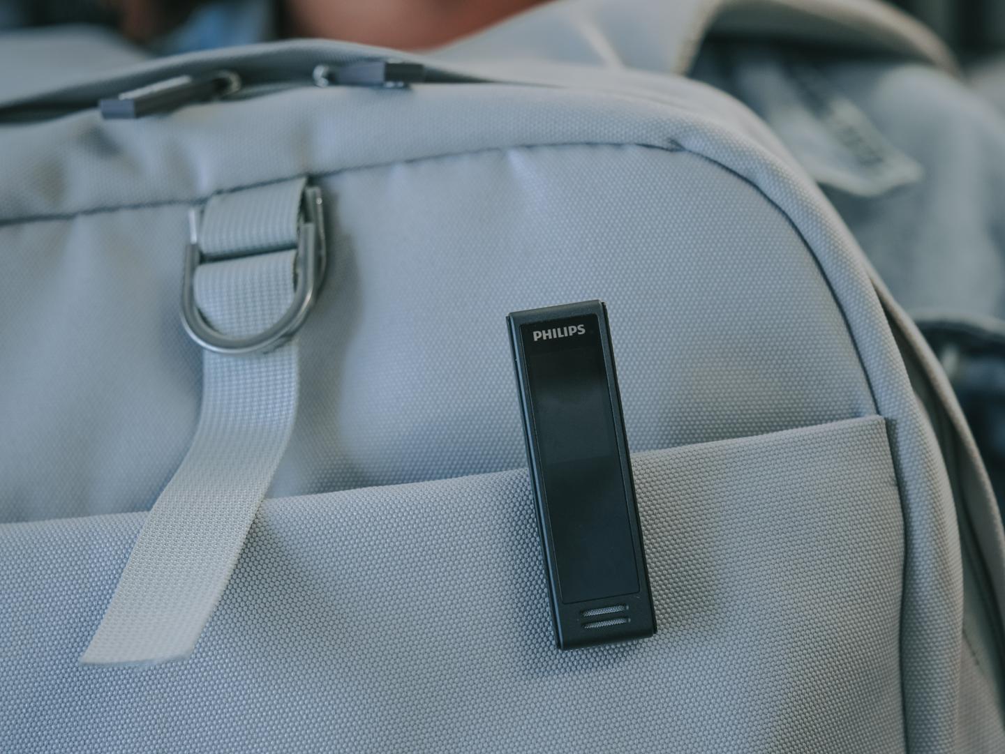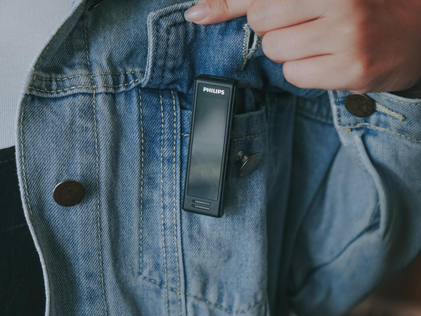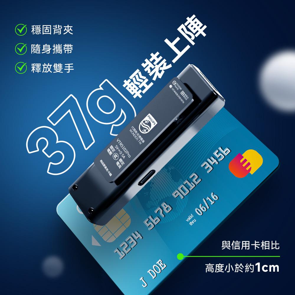 37g 輕量好攜帶,尺寸 7.6X2.2X1.05cm 比信用卡還小!機身被夾設計,可以夾在西裝外套、包包上,輕巧好攜帶!