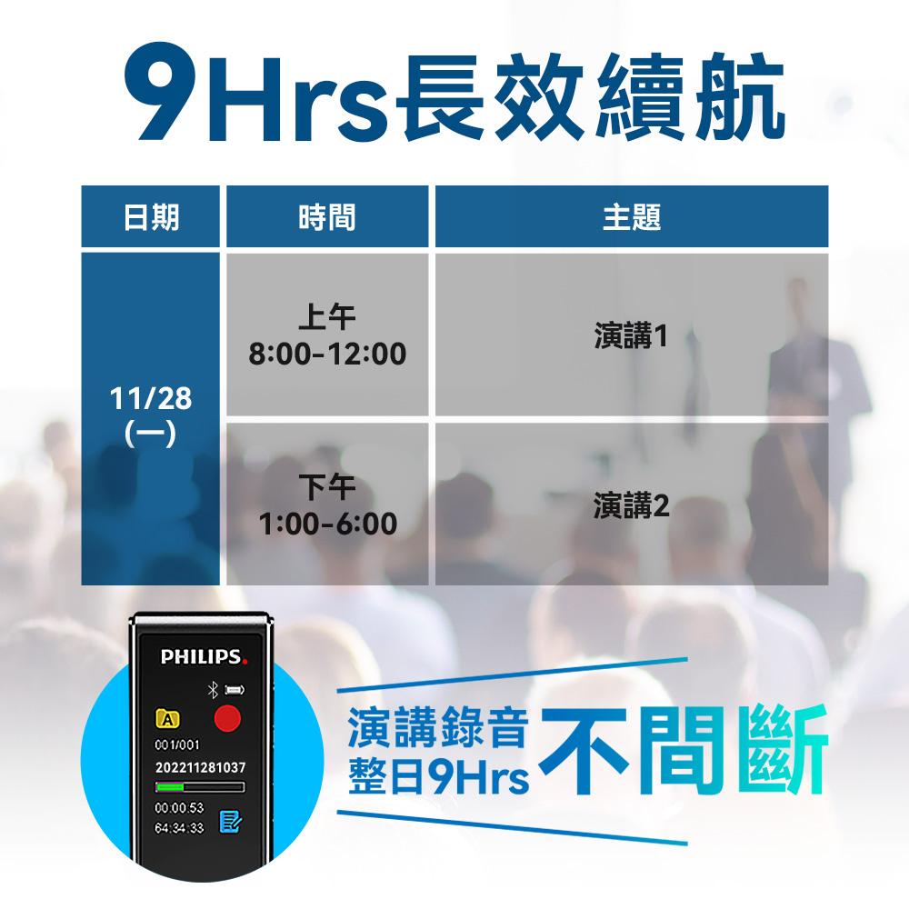 充電 2-3 小時後,即可達到單獨使用機器 9 小時長效錄製不怕沒電、連接 APP 使用約 5 小時,側邊 Type-c 邊充邊錄不設限,內容可存 16G 、 64小時 ,不必害怕出門在外不方便。