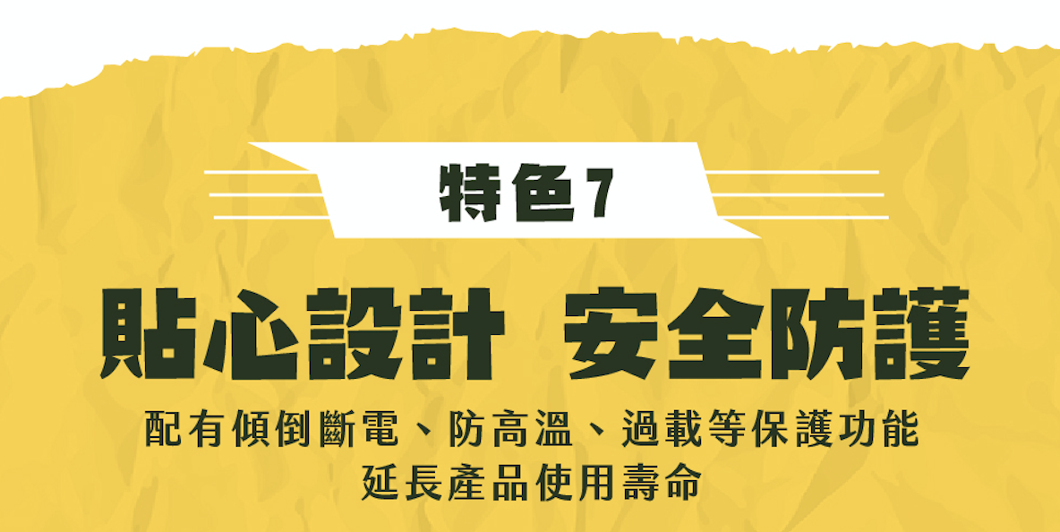 防傾倒開關一傾倒開關設計,不怕路途簸;120C高溫保護一溫度觸點時自動閉合,預防高熱造成危險;85V低壓保護一自動進行失壓、欠壓、過載、和短路保護的電器;10A過流保護一過充、過流、短路保護;讓你更安心自在、隨心所欲到處冒險。