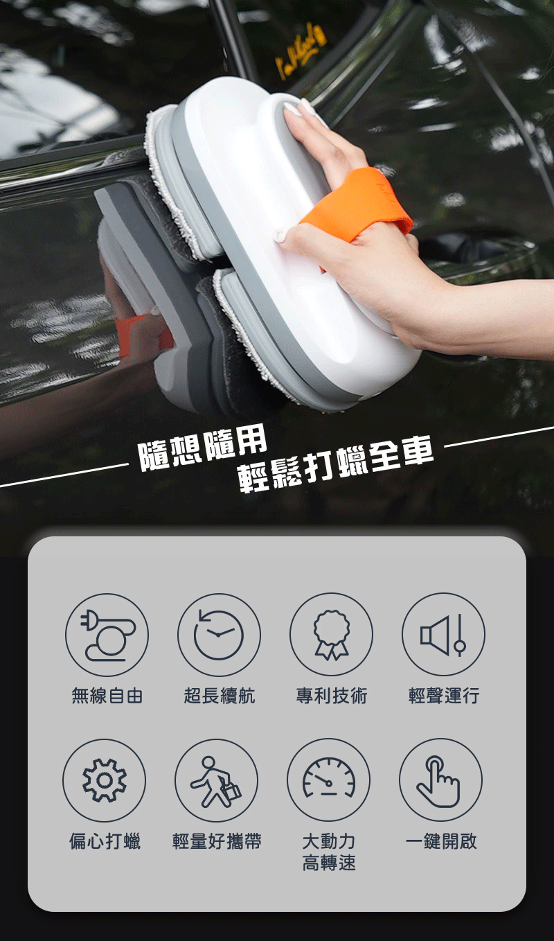 無線的設計,搭配一掌可操作的機型,重量僅 1.03 公斤,有別於傳統兩手操作的打蠟機,女生、小孩都能單手操作!揮別手酸的煩惱,輕鬆DIY愛車打蠟工作,讓你的車隨時亮晶晶。
